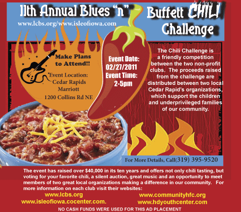 Once again the Linn County Blues Society and the Isle of Parrothead Club are joining forces for the annual Blues 'n' Buffet Chili Challenge on February 27, 2011 from 2-5PM!